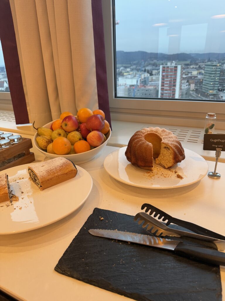 ホテル最上階に会場がありホーエンブルグ城がみえるし、ザルツブルグ駅を見下ろせるので晴れの日には最高です。ただ日本の観光地のようなモーニングビュッフェの広さはなく、あくまでもビジネスホテルのような少し狭い空間に感じました。